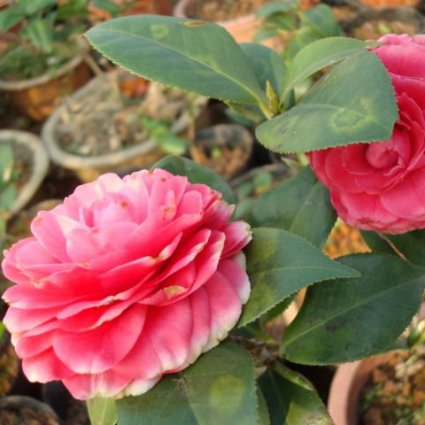 美国加州牛西奥苗圃从库玛撒卡(Kumasaka)品种实生苗中选育的机会苗,1975年初花,1986年公布。深粉红色,花瓣尖,层叠,完全重瓣,中到大型花,花径9-llcm;叶中等,8x5cm,深绿色,有光泽;紧凑,立性,长势旺;花期3-4月