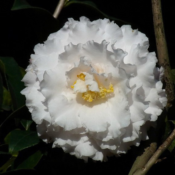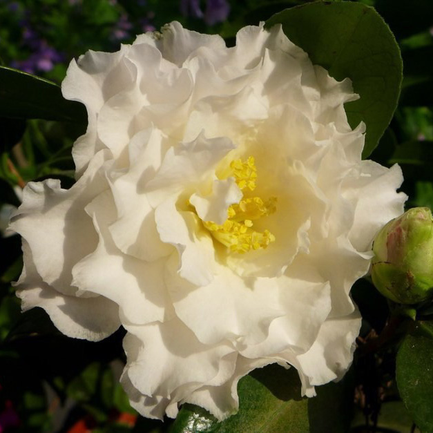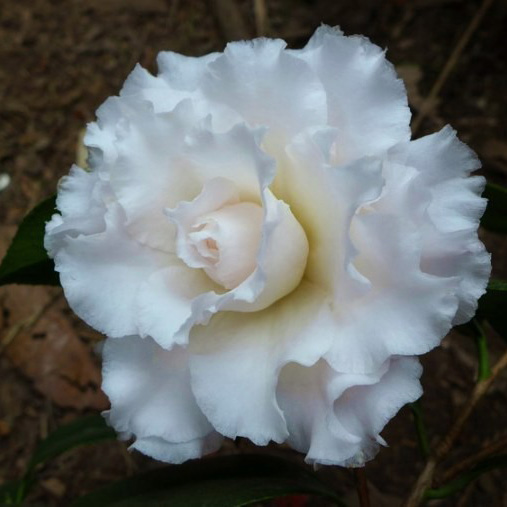 Frizzle White品种突变种,美国。白色,略泛羞红色,花瓣明显起皱有娟绸感,花蕾粉红色,半重瓣,大型花,花径11-l3cm;叶6x3.2cm,淡绿色;株形开张,长势慢;花期1-2月