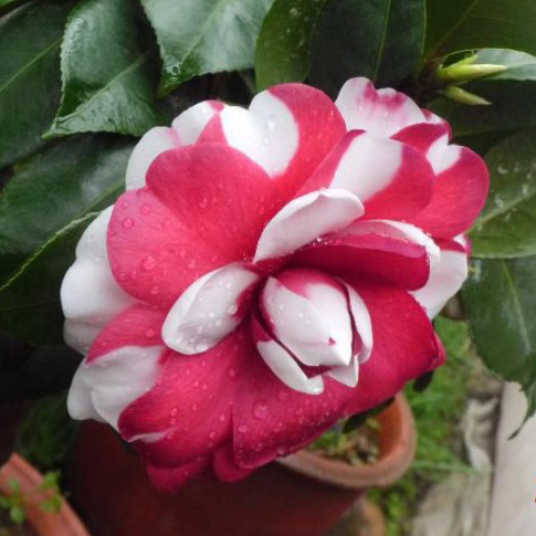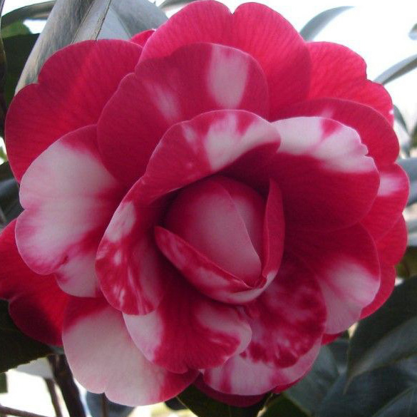 产地美国,花黑红色泛绒光,偶有白色斑块,重瓣,大型,花瓣圆,边缘内卷,覆瓦状排列,随着花朵开放,边沿逐渐成黑色,花朵稠密。生长旺,长势中