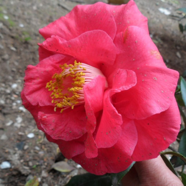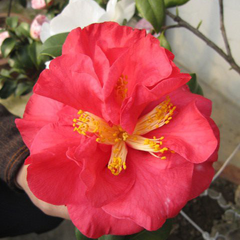 美国南卡罗来那州格里凡先生从美人鱼(Mermaid)实生苗中选育,1955年公布,珊瑚红色或浅红色,偶具红斑或白斑,花瓣边缘镶细白边,波浪状,大花瓣12-15枚,其中包括3-5枚扭曲直立花瓣,4-6轮排列,半重瓣,大到巨型花,花径13-l5cm,厚7.5cm;叶较大,12x6cm,浓绿,具光泽;株形中等,长势旺,立性;花期3-4月