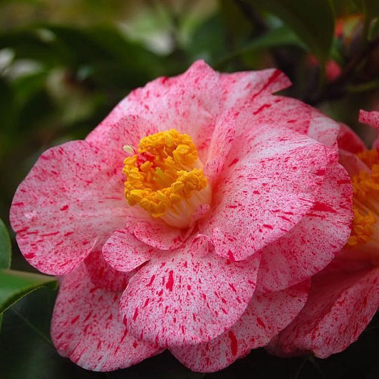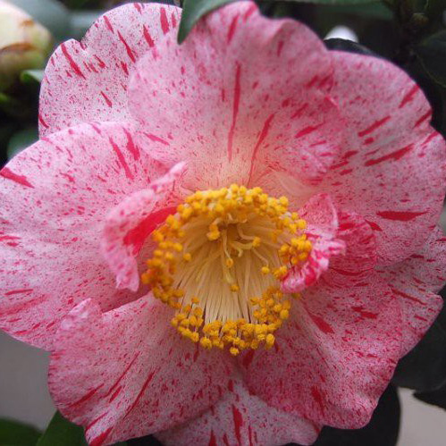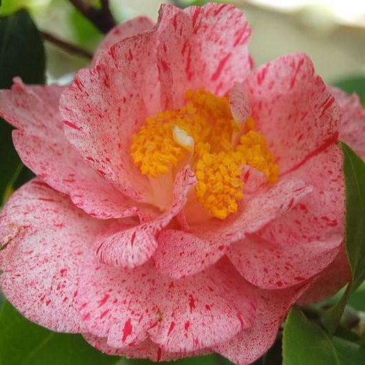 美国早期从日本引进,Akashigata品种的突变。花粉白色,有无数散射状的红色斑点和条纹,半重瓣,大型花,花瓣宽圆,外翻,边缘不规整或波浪状,花心雄蕊金黄 色。叶片浓绿,阔椭圆形,光亮,偶有白斑;植株开张,生长旺,花期中到晚