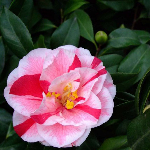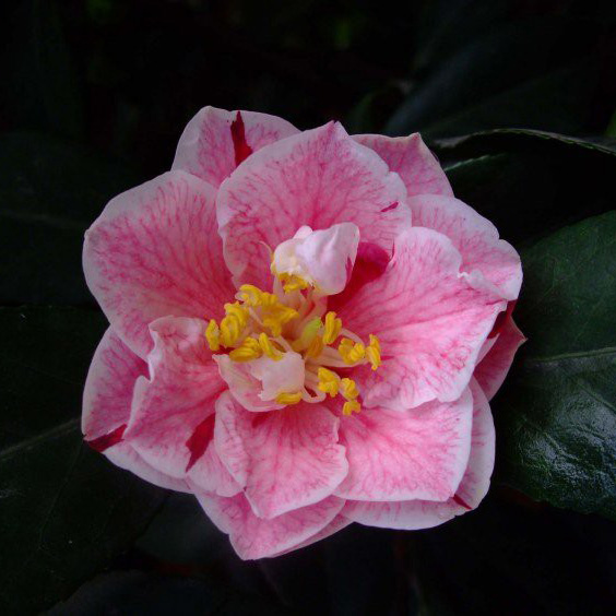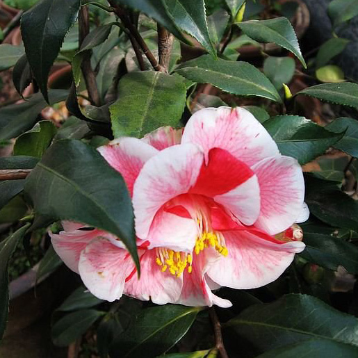 日本江户地区传统品种,1968年即有记载,1887年,范豪特(L. van Houtte)将其引种到比利时并重命名为范西塔特夫人。白色具玫瑰红彩条纹,花瓣宽大,倒卵形到圆形,长宽4.5cm左右,先端尖,边缘波浪状,18-19枚,3轮排列,半重瓣,中型花,花径8-10cm;叶狭窄椭圆形到椭圆形,10x4cm,暗绿色有光泽,边缘具细锯齿,主脉明显,如冬青叶;株形紧凑,立性,长势中等;花期3-5月。本种花色非常不稳定,常会发生各种色彩变化