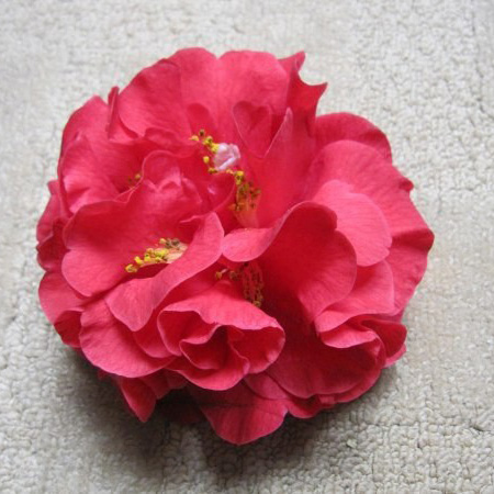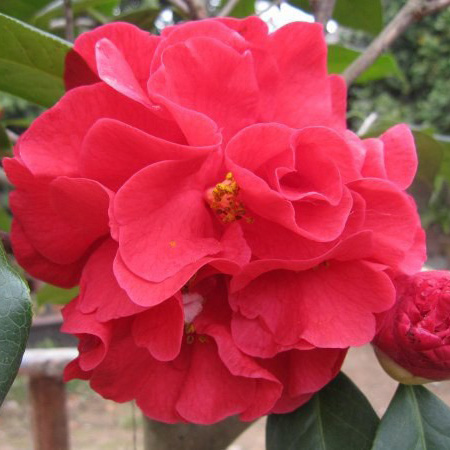 美国培育品种,是(大桃红)品种与(珍妮帕赛尔)杂交后获得的一个云南茶花品种,艳红色,大到巨型花,直径11-l5cm,牡丹型或半重瓣,叶厚大,浓绿,长势旺,立性生长,花期2月至3月底盛开