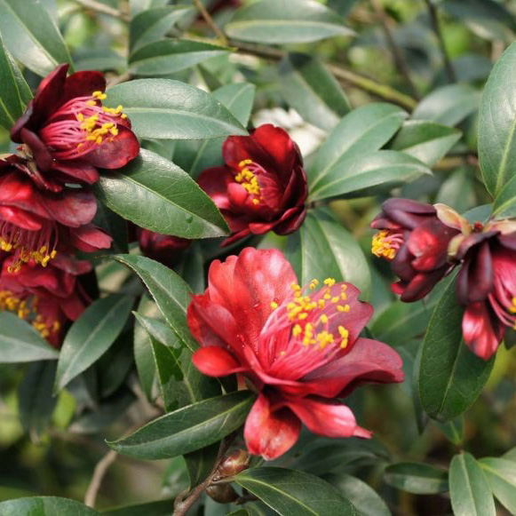 宝石钟(Ruby Bells)与日本红山茶品种黑椿(Kuro-tsubaki)杂交种,新西兰O. Blumhardt培育,1984年公布。极重的黑红色,花瓣22枚,狭窄,质厚重具腊质感,半重瓣,微型花,花径5-6cm; 叶偏小狭长,7x2.5cm,主脉绿,芽深黑红,光滑,嫩叶、叶脉及枝条紫红色;株形小,紧凑,立性,长势慢;花期2-5月