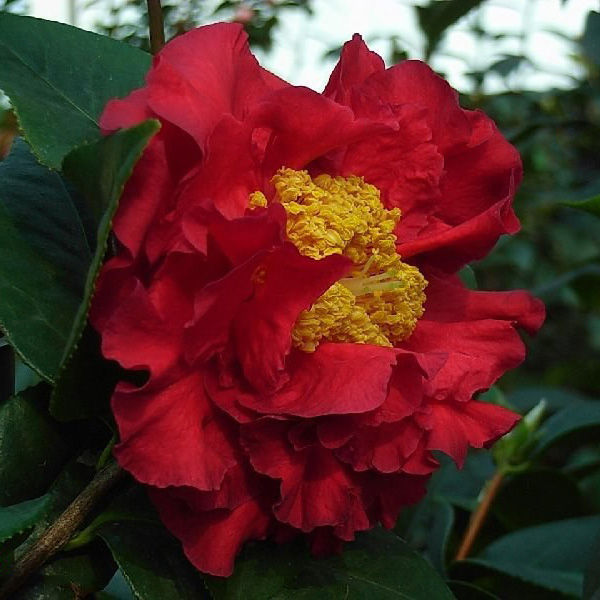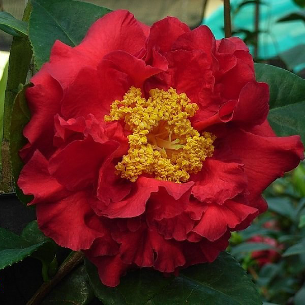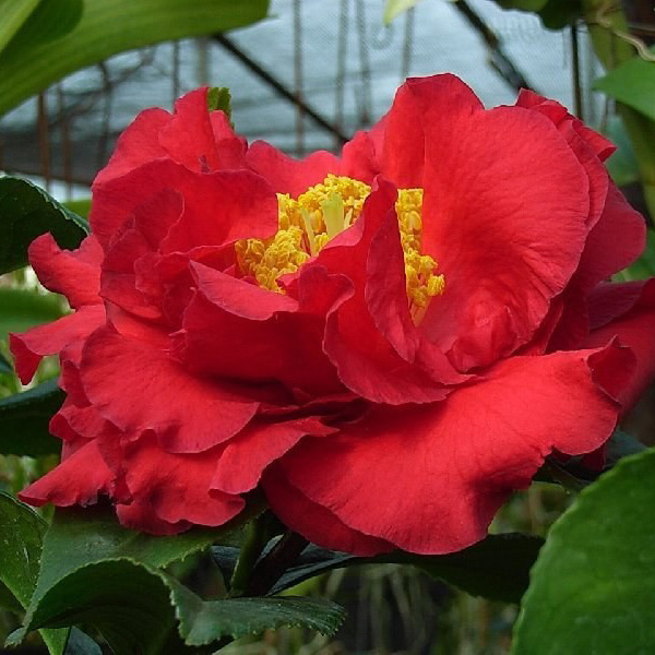 美国加州弗兰克泊塞尔(Frank Pursel)先生培育的云南茶花杂交种,云南茶花品种紫袍(Crimson Robe)x [大玛瑙(Damanao) x 红山茶品种戴维斯夫人(Mrs D.W. Davis)] x 大玛瑙(Damanao),1980年公布。深玫瑰红色并具较深脉纹,花瓣15-18枚,较厚,直立,半重瓣,巨型花,花径15.5cm,厚10cm;叶片大,11x8cm,深绿色,锯齿深,嫩枝粉红,叶柄朱红,嫩叶橙红;株形开张,立性,长势旺;花期1-3月。 有突变种:复色哈里森
