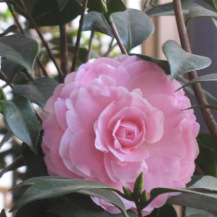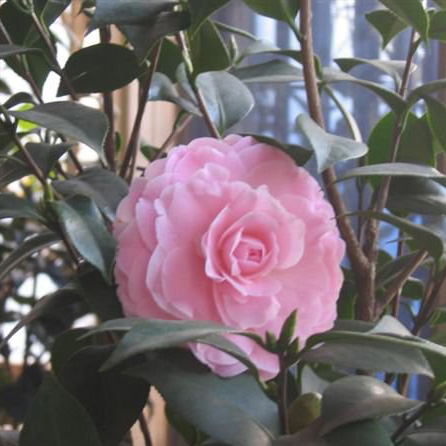 美国路易斯安那州Vi Stone选育的红山茶机会苗,1976年公布。非常柔和的淡羞红色,花瓣边缘为粉白色,花瓣平展,40枚,2-3轮覆瓦状排列,完全重瓣,中型花,花径9cm,厚2.5cm;叶绿色,10.5x3.5cm;株形开张,立性,长势中等;花期1-2月