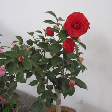 澳大利亚培育,花深红,重瓣,中到大型,花瓣长圆形,覆瓦状排列,瓣间略松散,花朵稠密。叶浓绿,椭圆。株型紧凑,长势旺,花期中