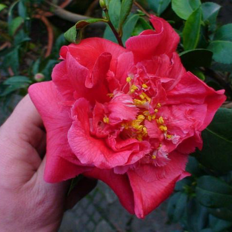 美国培育品种,淡紫色,多数花瓣带均匀锯齿,重瓣或牡丹重瓣,花径中到大,直径9~l3cm;叶长尖,平直,幼牙苞片泛红。花期1-2月