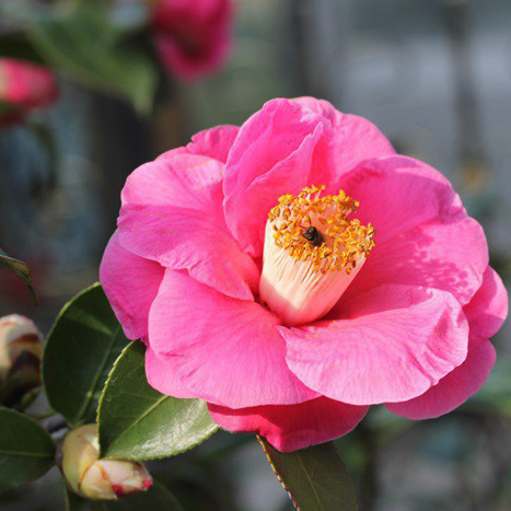 云南杂交种,美国北卡罗来纳州Chapel Hill.Dr Clifford R.Parks于1995年发表。C.reticulataXC.fraterna(毛花连蕊茶),单瓣,玫瑰粉,花瓣8枚,中型花(8X3厘米),黄 色花药,粉红花丝,刚开时具大型花蒂,深红花萼,尤如冷天里火红的蜡烛。树性直立,长势强,耐寒