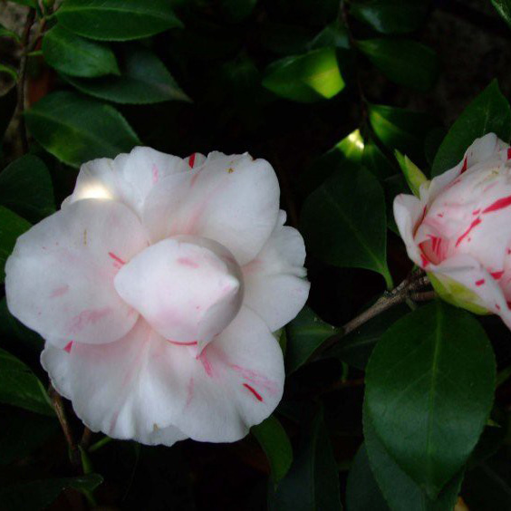 美国加州明星苗圃(Star Nursery)从日本引种,原种名不详,1941年公布。白底带红色条纹或斑点,偶然会有纯红色花朵,55枚花瓣,倒卵形,4.5cmx3.5cm,外轮花瓣内凹,玫瑰重瓣型,中型花,花径9cm,厚5cm;叶弓形,10x5cm,深绿色,浅锯齿状;长势旺;花期1-3月