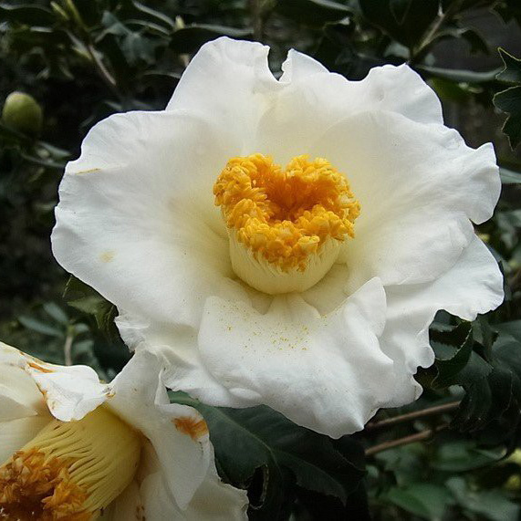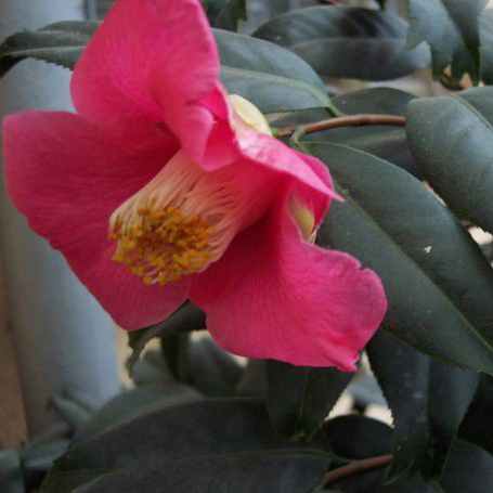 日本的一个古老观叶性茶花品种.本品种实际上有三个类型,窄叶红花、宽叶白花(白金鱼叶椿)和宽叶粉花,这里介绍的是“窄叶红花”和“宽叶白花”品种,最早记载于17世纪。鲜艳的淡红色到红色.花瓣7枚左右.雄蕊呈筒状.花药淡黄色.小到中型花.单瓣型;叶浓绿·窄长.先端似鱼尾状;长势旺.开张;花期中