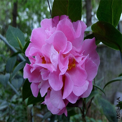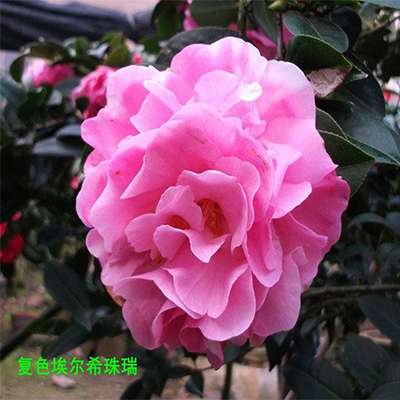 花活泼的粉红至深粉红色,有时会略带紫色,牡丹型,大到巨型花,最大花径可达14公分,厚10公分,花瓣波浪状,雄蕊淡黄 色,开花性好。叶片卵圆形,淡绿色,表面粗糙,植株开张,生长旺盛,花期中至晚。