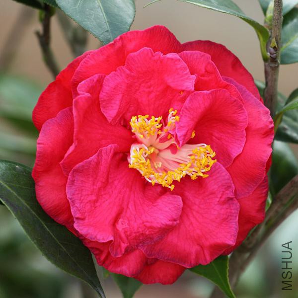美国育成。最新红山茶品种。黑紫红色,半重瓣型,巨型花,花径15cm左右,花朵厚度7cm,花瓣40枚,假花瓣20-30枚,花蕊黄 色。植株立性,紧凑,长势中等;叶片与一般茶花相比显得很另类,绿色,叶大似枇杷叶,叶长15cm,宽10cm.。是观花观叶价值都极高的茶花新品种。花奥斯卡为奥斯卡的复色变种,黑紫红色带漂亮的白斑,其余性状同母本