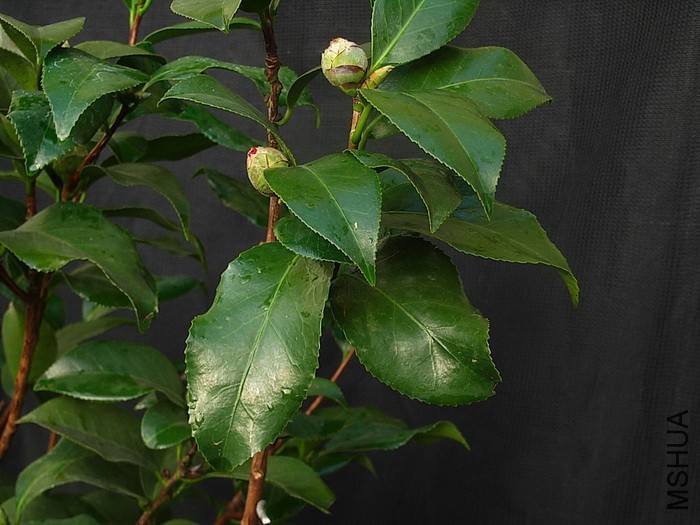 美国培育品种,迷人的艳红色,排列整齐的重瓣,楚楚动人;叶浓绿,具光泽;生长中等,立性,花期1月至3月底盛开
