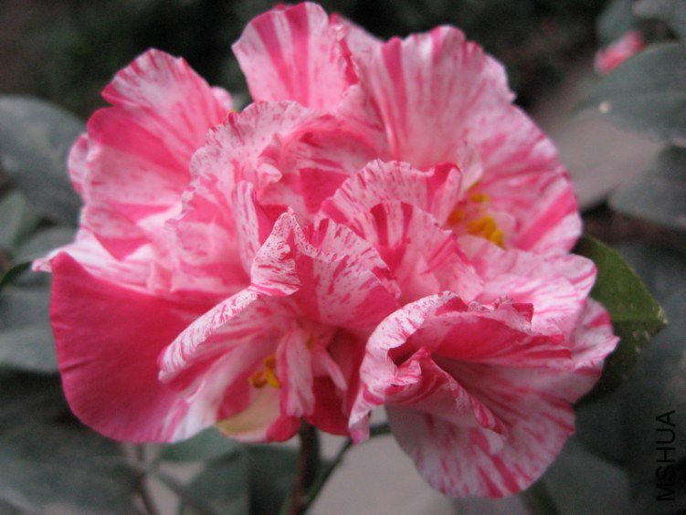 美国佐治亚州希尔斯曼博士(Dr P.L. Hilsman)选育的红山茶机会苗,1956年公布。白色泛嫩粉红色,遍布火鸡红色条纹或斑点,花瓣波状,起皱,约30枚,5cm长,半重瓣到不完全重瓣,中到大型花,直径10-12cm,厚8cm;叶暗绿色,厚质,10x4cm,顶锐尖,脉纹重;枝叶密,株形开张,立性,长势快;花期1-3月