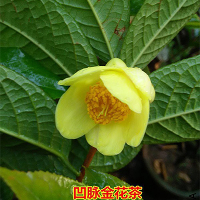 花淡黄 色,单瓣型,微型至中型花,1~2朵腋生或顶生。花瓣9~12枚,椭圆形,瓣端全缘,花冠呈喇叭状,雄蕊放射状。叶片椭圆形或长椭圆形,先端渐尖或急尖,基部宽楔形至钝圆,叶脉深凹,叶齿细锐,叶片背面有绒毛。植株立性,生长旺盛,花期早至中。注:金花茶都不耐寒,低于0度应搬到室内或采取防冻措施