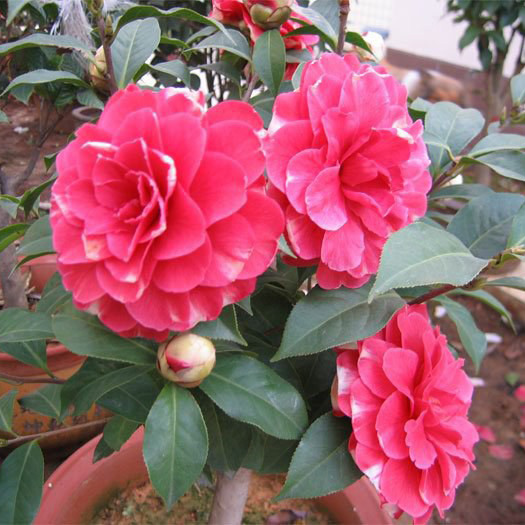 1980年美国登录,大玛瑙与珍妮波塞尔的杂交品种, 鲜艳的深粉红色带红色脉纹,花瓣边缘呈白色,巨型花,完全规则性重瓣。长势好,立性生长,花期中到晚