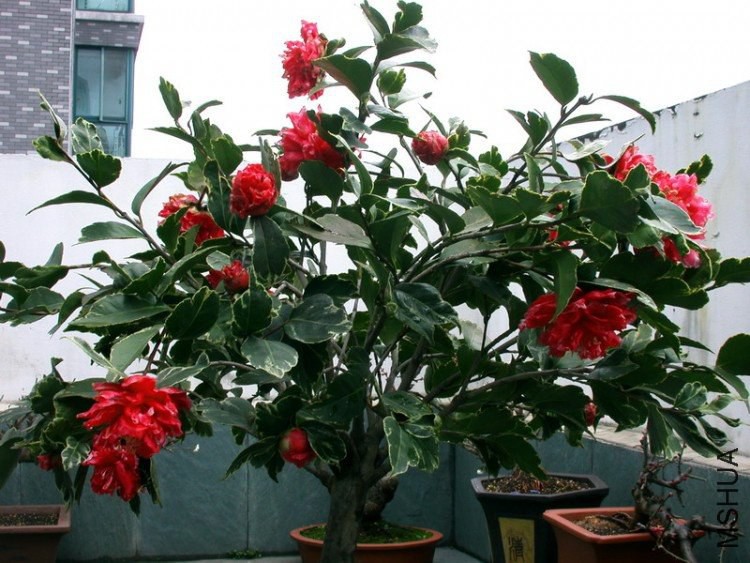 日本人1949年从花牡丹分离出的一个突变品种。红色, 花瓣上洒不规则白斑与污斑,中到大型花,牡丹型;叶形不规则,边缘有白边;生长慢,立性;花期早。