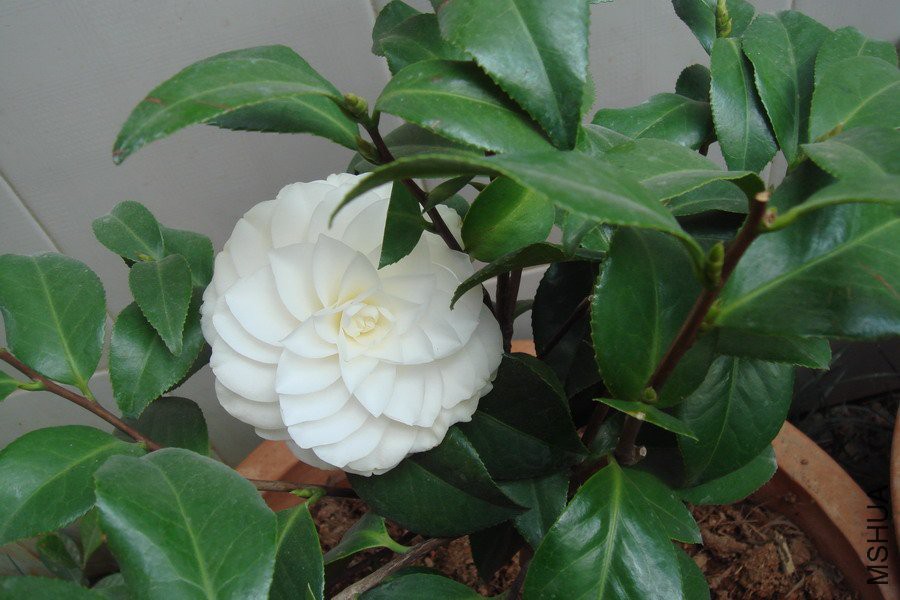 紅山茶,1977美国路易士安納州T a mmia種苗園。完全型到螺旋形,純白色,中輪到大輪(10公分),樹性直立,長勢中等,葉橢圓形,深綠色,葉面平滑光亮,葉脈平,植株容易照顧,但要開出好花有些難度