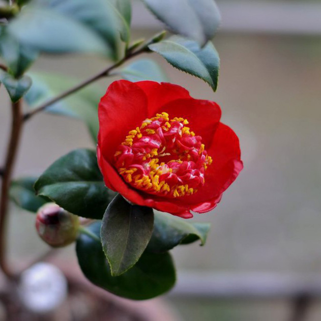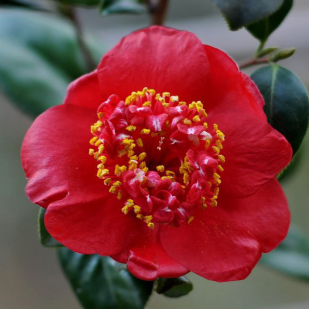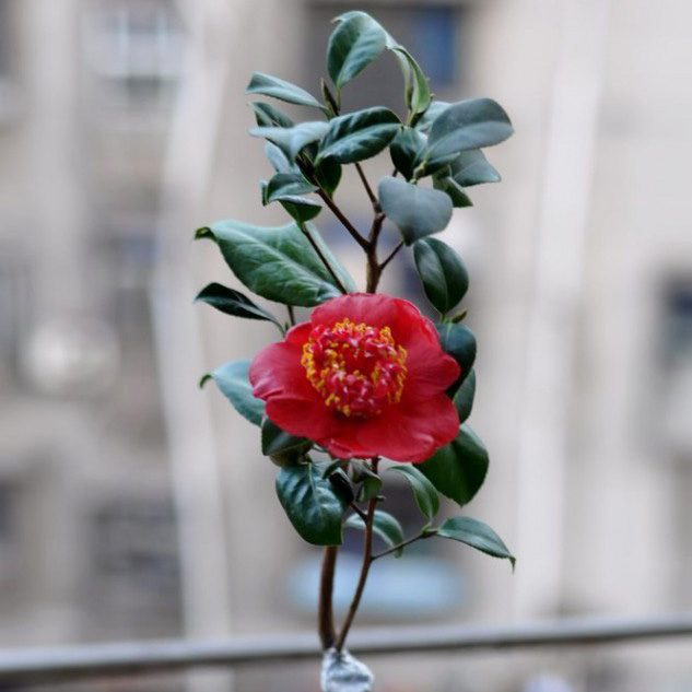 外轮花瓣鲜艳的红色,中心雄蕊瓣白色,花型奇特,托桂型,小型花,花径6-7cm。叶绿色,光滑,卵形,灌木状,茂密,株形中等,立性,长势中等。花期2月至3月。在美国育成,1962年公布