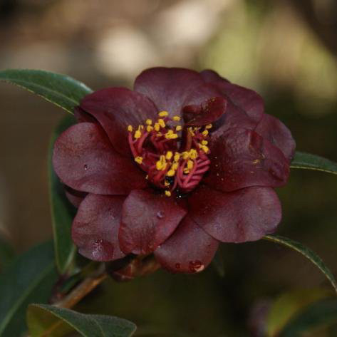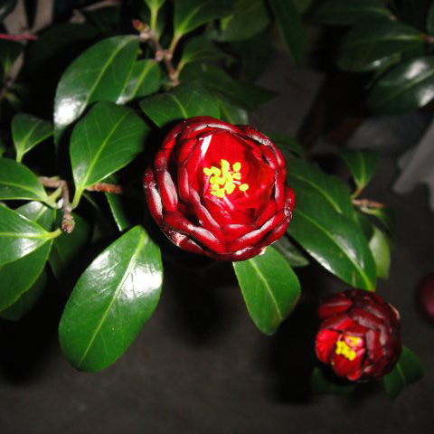 日本最黑的品种之一,1829年公布。黑红色闪蜡光,有黑红色脉纹,花瓣排列似松子,有时花瓣会向外大翻卷,花丝红色,呈筒状,雄蕊黄色,半重瓣,小型花,花径6~9cm;叶片小,8x3.5cm,尖椭圆形至椭圆形,深绿色,有光泽,边缘具细锯齿,幼嫩时紫色,叶柄无毛,叶芽发黑;株形中等,灌木状,立性,长势中等,开张;花期4-5月